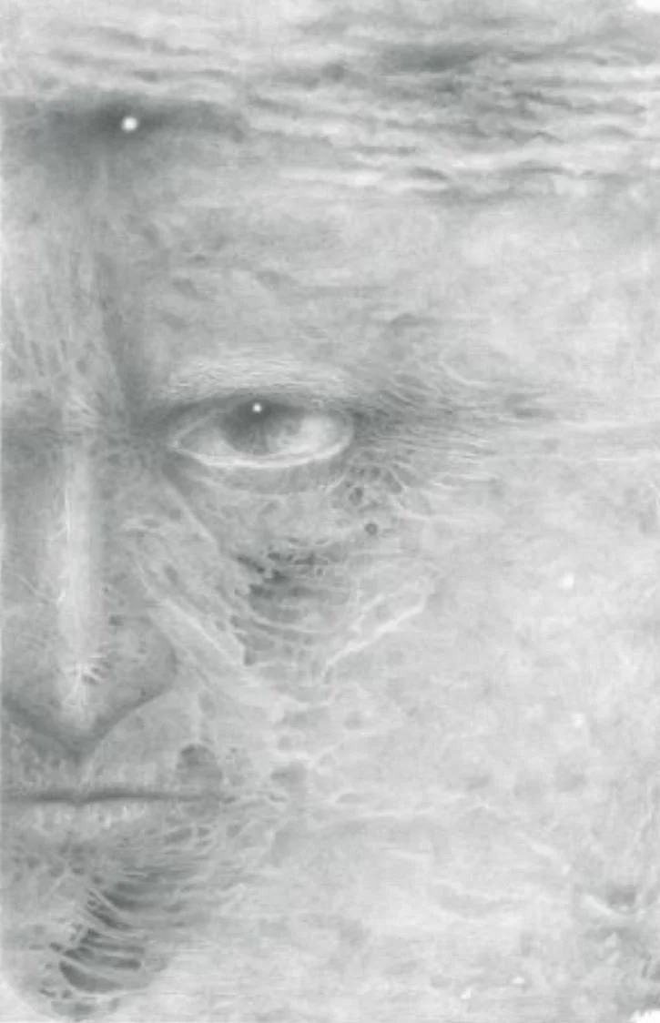 WORMWOOD is a graphite on paper drawing. The face is of an imaginary character from a book by C.S. Lewis, “The Screwtape Letters.” The book is a clever way to discuss good and evil. Screwtape is the uncle demon writing letters and words of wisdom to his apprentice nephew about how to keep his “patent” from God, their enemy. In my mind the story continues with Wormwood the former apprentice, now the master; redefining good and evil and what it is in the 21st century—and really what it has always been—the blind spots of ignorance that exist within the reality of the world we construct.